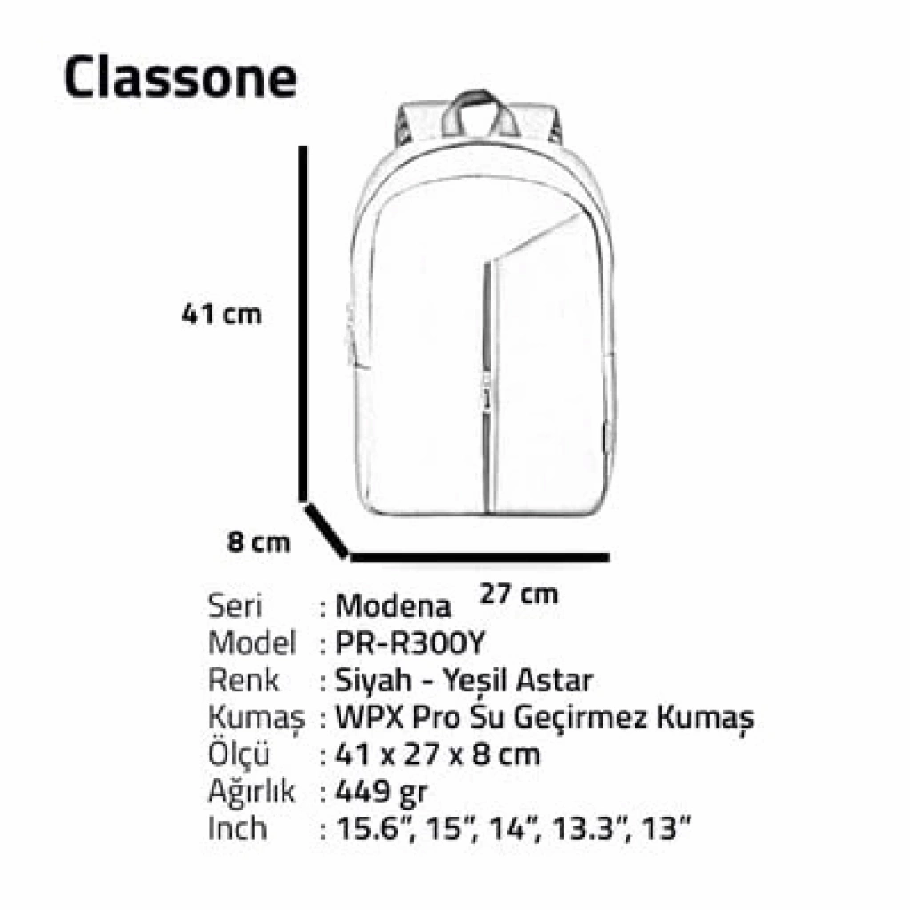 Classone Modena Serisi PR-R300Y 15.6 İnç Notebook Sırt Çantası-Siyah-Yeşil Astar