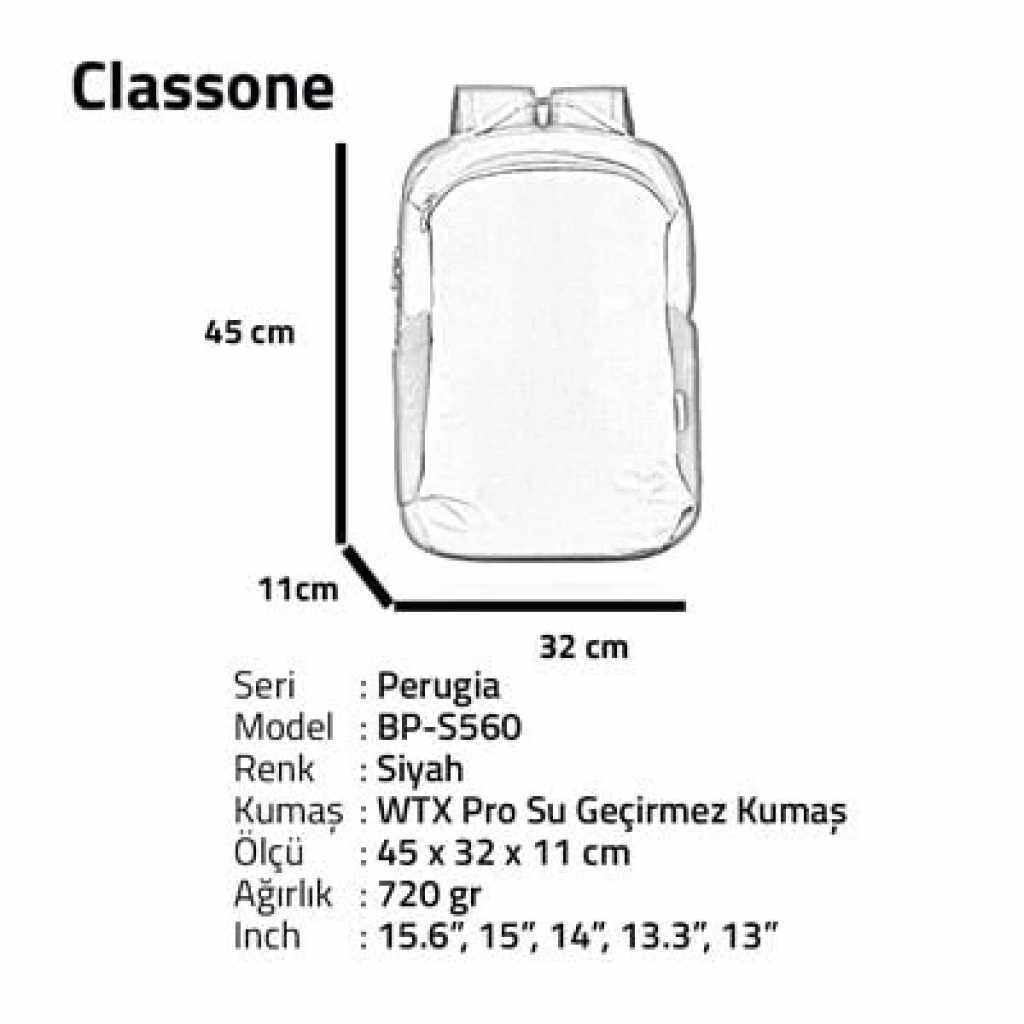 Classone Perugia Serisi BP-S560 WTXpro Su Geçirmez Kumaş 15.6 inch WTXpro Notebook Sırt Çantası –Siyah