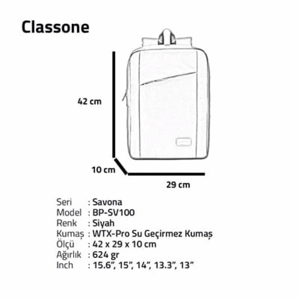 Classone Savona Serisi, BP-SV100 WTXpro Su geçirmez Kumaş ,15.6" Sırt Notebook Çantası-Siyah