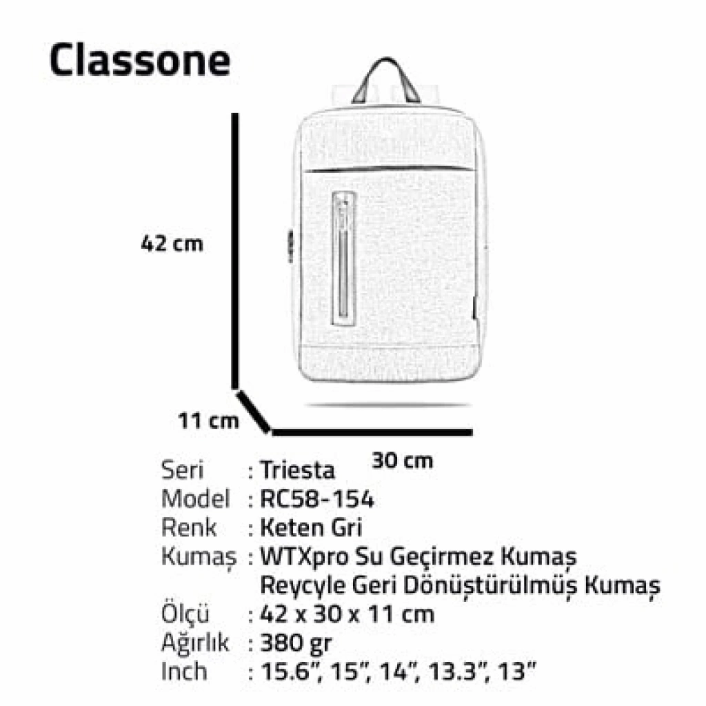 Classone Triesta Serisi, RC58-154 Recycled kumaş , 15.6 inch Uyumlu Macbook, Laptop , Notebook Sırt Çantası- Keten Gri