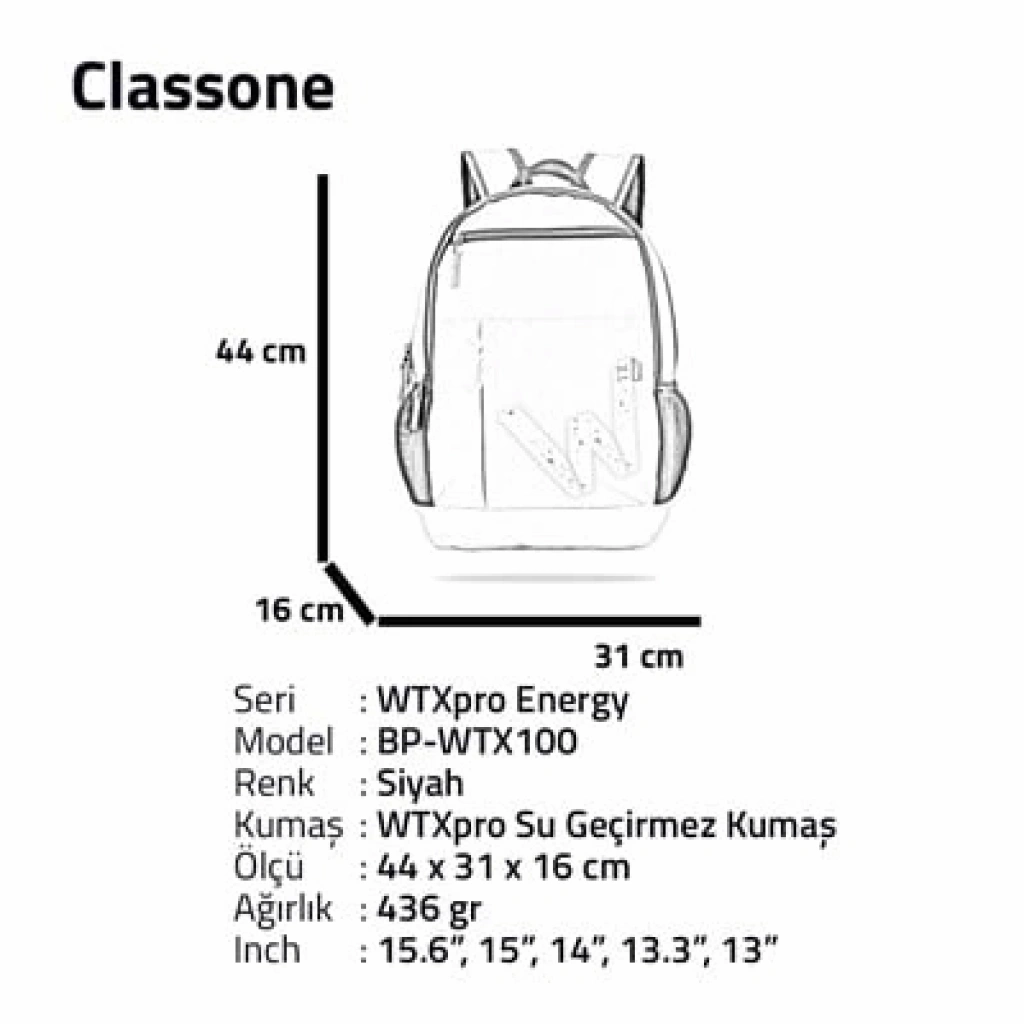 Classone WTXpro Energy Serisi BP-WTX100 15.6 inch Uyumlu Macbook, Laptop , Notebook Sırt Çantası- Siyah